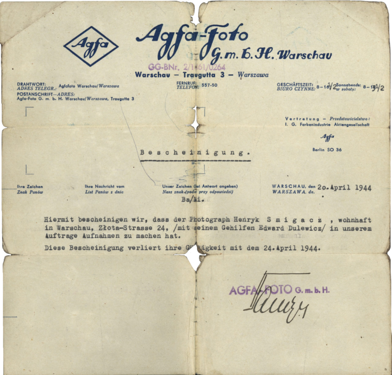Zaświadczenie firmy Agfa-Foto dla Henryka Śmigacza i jego asystenta Edwarda Dulewicza, Warszawa 20 kwietnia 1944 r.