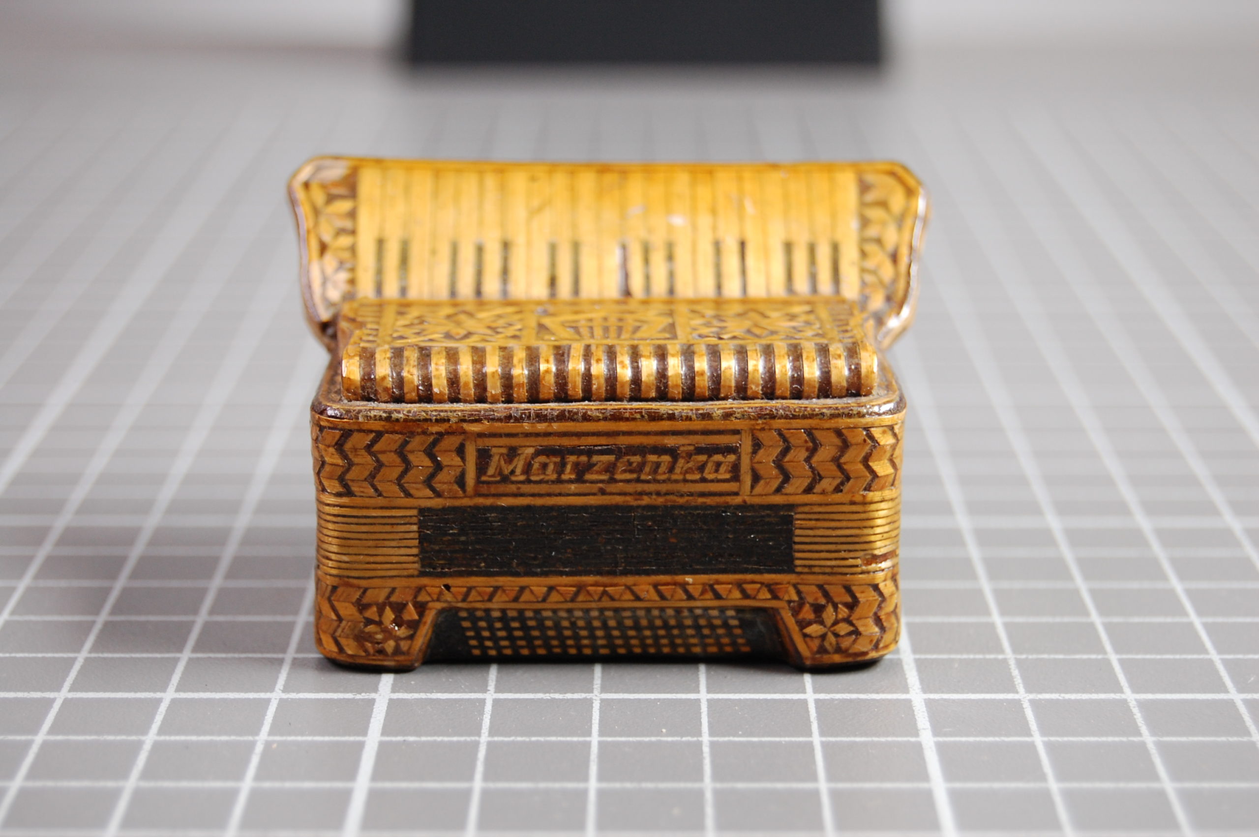 Misterna miniatura akordeonu została wykonana z kawałków chleba. Umieszczony na niej ozdobny napis może świadczyć, że pracę nad tą niezwykłą „pamiątką z Montelupich” Dutka ukończył 20 lutego 1947 r. Widoczna na fotografiach powłoka z lakieru nałożona została znacznie później w celu zabezpieczenia miniatury.
